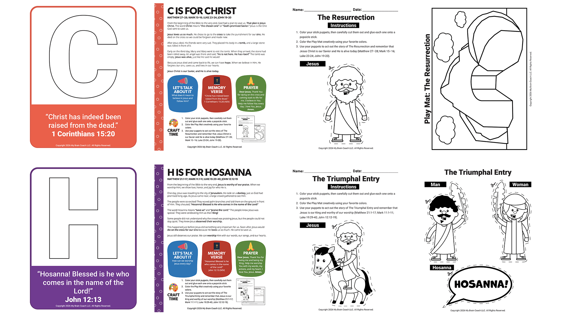 Each lesson highlights the story of Jesus’ triumphal entry, His death on the cross, and His resurrection, connecting Scripture through a Bible story and memory verse. Children engage with God’s Word through meaningful conversation, prayer, and hands-on activities that help them understand and remember what they are learning.